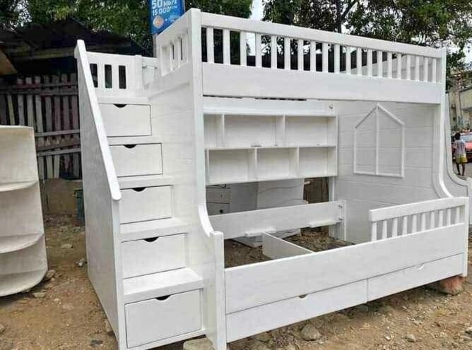 Lit superposé en bois blanc avec escalier à tiroirs et espace de rangement intégré. Idéal pour les chambres d'enfants ou les dortoirs.