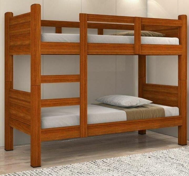 Lit superposé en bois massif pour deux personnes. Sécuritaire et robuste, idéal pour les chambres d'enfants ou les dortoirs. Comprend des échelles pour un accès facile.