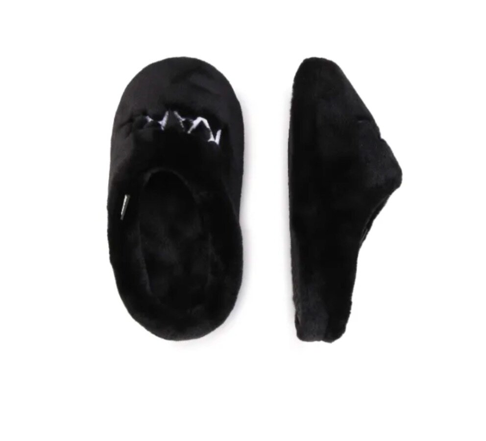 black/white faux-fur design embroidered logo to the front round toe slip-on style flat rubber sole