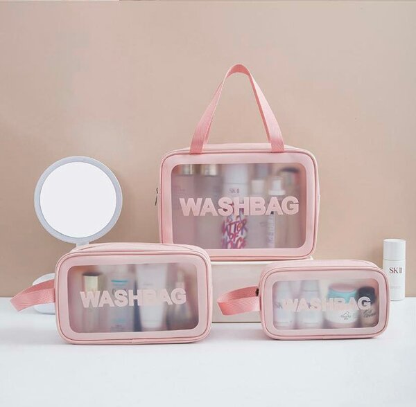 Lot de 3 sacs étanches de rangements composés de trousse de toilette de cosmétique, rose