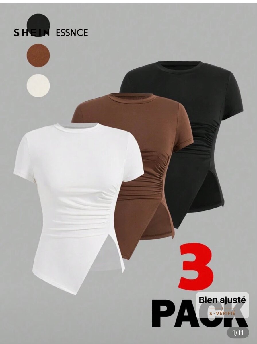 Profitez de ce pack de 3 T-shirts ajustés, parfaits pour un style quotidien chic et confortable. Disponibles en blanc, brun, et noir, ils se marient facilement avec toute garde-robe. Leur découpe asymétrique et leur tissu doux offrent confort et style en toutes occasions.