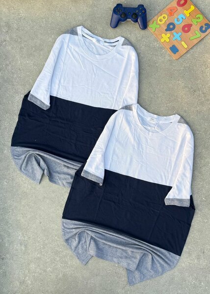 Lot de 2 t-shirts blancs/noirs/gris neuf. Style original colorblock, parfait pour compléter un look moderne à petit prix.