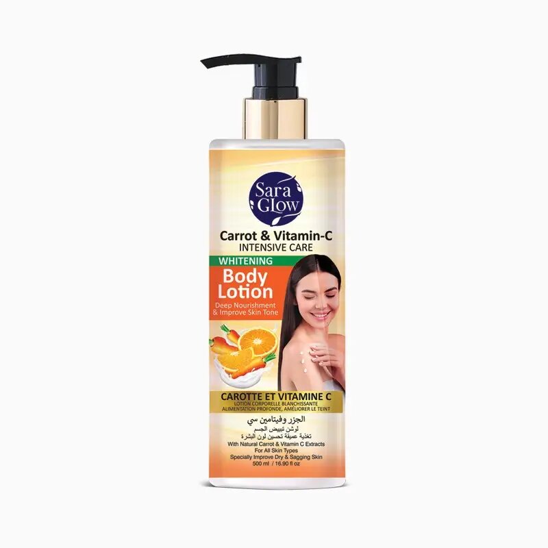 Profitez d'une peau nourrie et éclatante avec le lotion corps Sara Glow enrichi en carotte et vitamine C. Idéal pour un teint uniforme et une hydratation intense, il est spécialement conçu pour les peaux sèches et ternes. Transformez votre routine de soin dès aujourd'hui !
