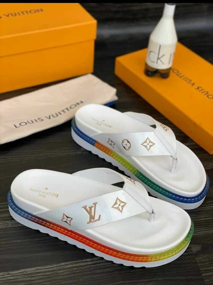 Mules Louis Vuitton blanches avec des accents arc-en-ciel. Conçues pour un confort et un style ultime, ces sandales présentent des détails emblématiques de LV et un design vibrant. Parfaites pour l'été, elles ajoutent une touche de luxe à vos tenues décontractées. Disponibles avec boîte et pochette de protection.