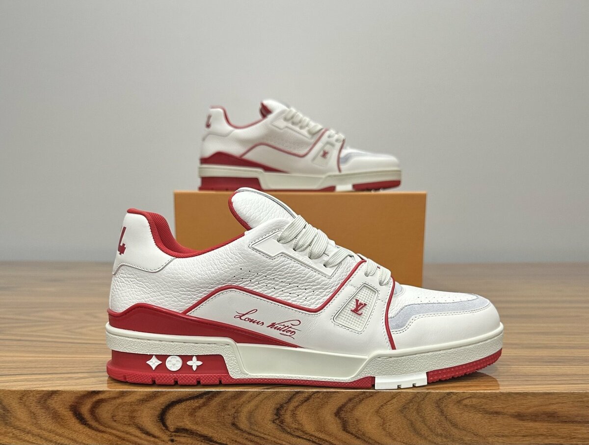 Baskets élégantes Louis Vuitton en cuir blanc et rouge. Confort inégalé pour un look audacieux. Idéal pour les occasions décontractées et stylées. Parfait choix pour les passionnés de mode.