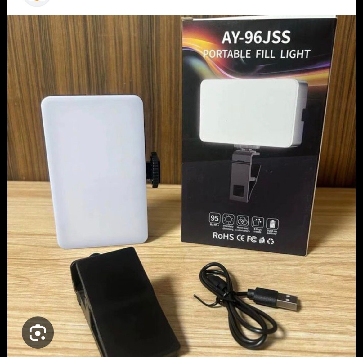 Lumière de remplissage LED portable AY-96JSS rechargeable par USB, idéale pour la photographie, les vidéos et les selfies. Compacte et légère, elle offre un éclairage doux et uniforme.