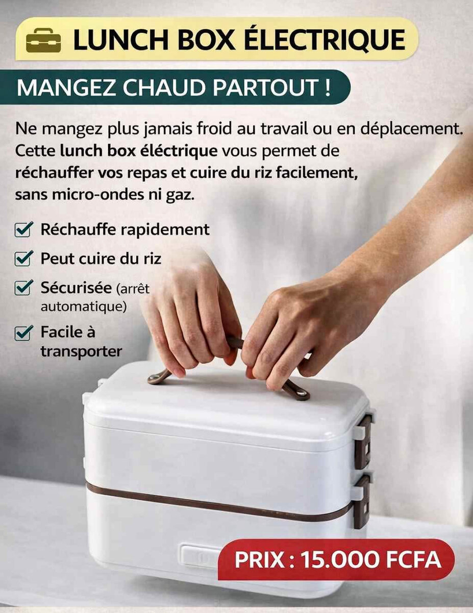 Profitez de repas chauds partout avec notre lunch box électrique. Réchauffe rapidement et peut cuire du riz. Facile à transporter et sécurisée avec arrêt automatique. Idéale pour le travail ou en déplacement. Mangez chaud sans micro-ondes !