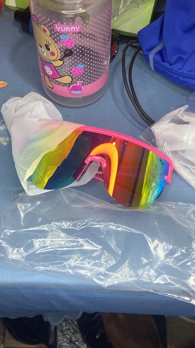Lunettes de soleil futuristes avec verres teintés arc-en-ciel et monture rose. Idéales pour un look audacieux en extérieur ou pour des festivals. Protection UV assurée pour vos yeux.