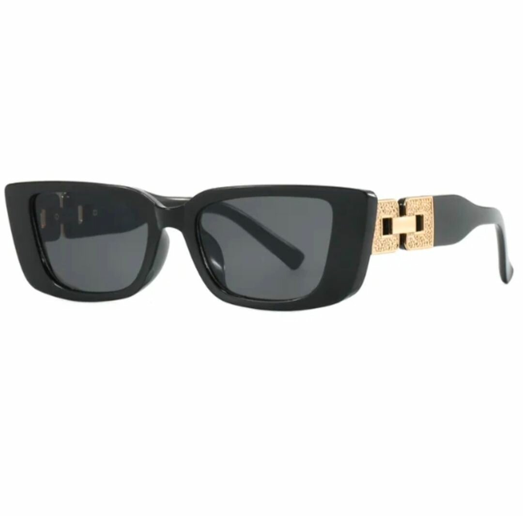 Élégantes lunettes de soleil avec monture noire et détails dorés. Parfaites pour un look chic et moderne.