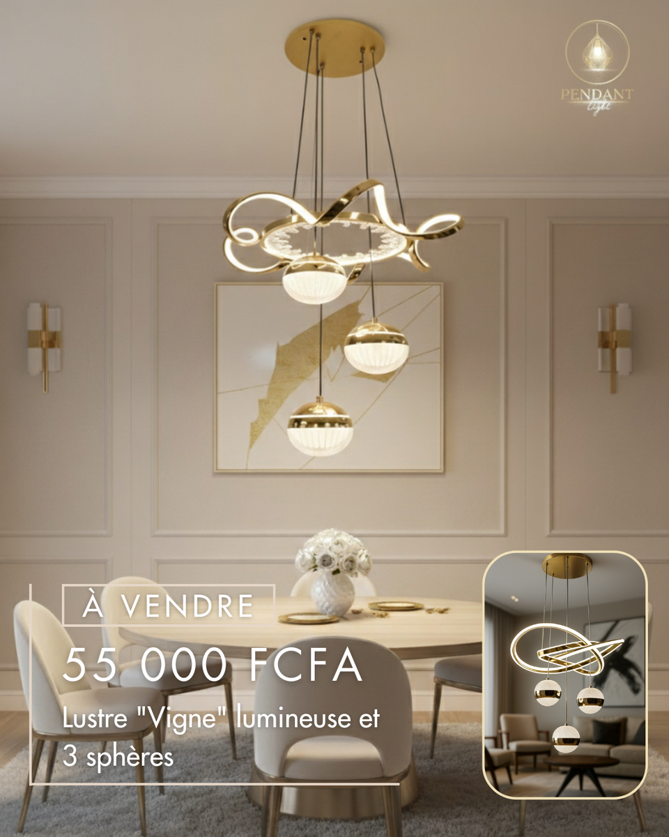 Élégant lustre "Vigne" avec design contemporain et 3 sphères lumineuses. Parfait pour salon ou salle à manger. Ajoutez une touche de sophistication à votre intérieur avec cette pièce centrale unique en son genre.