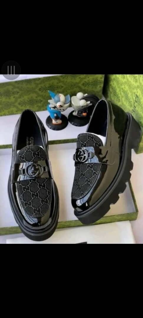Elevate your style with these luxurious black platform loafers, perfect for any fashion-forward look. Crafted with a stylish monogram design and glossy finish, they provide both comfort and elegance. Ideal for upscale events or making a statement in everyday wear.