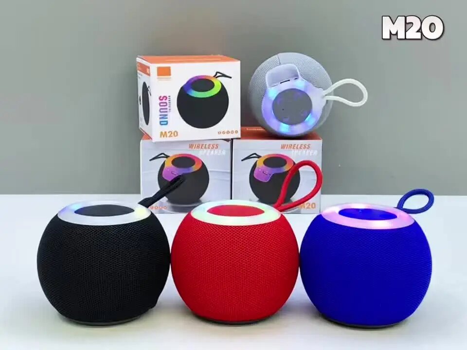 Portable M20 wireless Bluetooth speaker in multiple colors. Waterproof and compact design, perfect for outdoor activities, home use, and more.