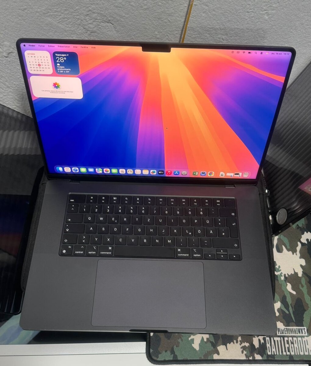 PC MacBook Pro M4 Max (Retina 16 pouces 2024) Processeur Puce Apple M4 Max 14Cœurs 36Go Ram 1Terra SSD Écran Retina 16 pouces Clavier Qwertzu dorigine lumineux Autonomie : 16h Capacité 99% Cycle de charge 40