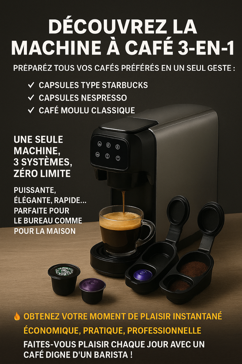 Découvrez la machine à café idéale pour tous vos moments café. Compatible avec capsules Starbucks, Nespresso et café moulu classique, elle est parfaite pour le bureau comme pour la maison. Profitez d’un café digne d’un barista, économique et rapide !