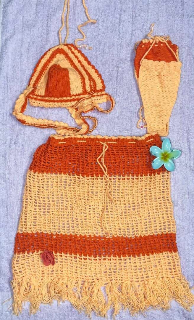 Optez pour un style bohème avec ce maillot de bain crocheté à la main. Parfait pour la plage, il allie confort et élégance avec ses tons chauds orangés. Un incontournable pour vos vacances!