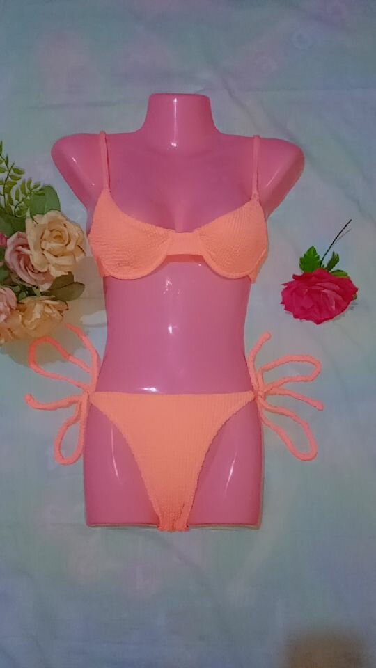 Maillot de bain 2 pièces push-up orange avec liens latéraux. Conçu pour sublimer votre silhouette, il est parfait pour la plage ou la piscine. Tissu confortable et élégant.
