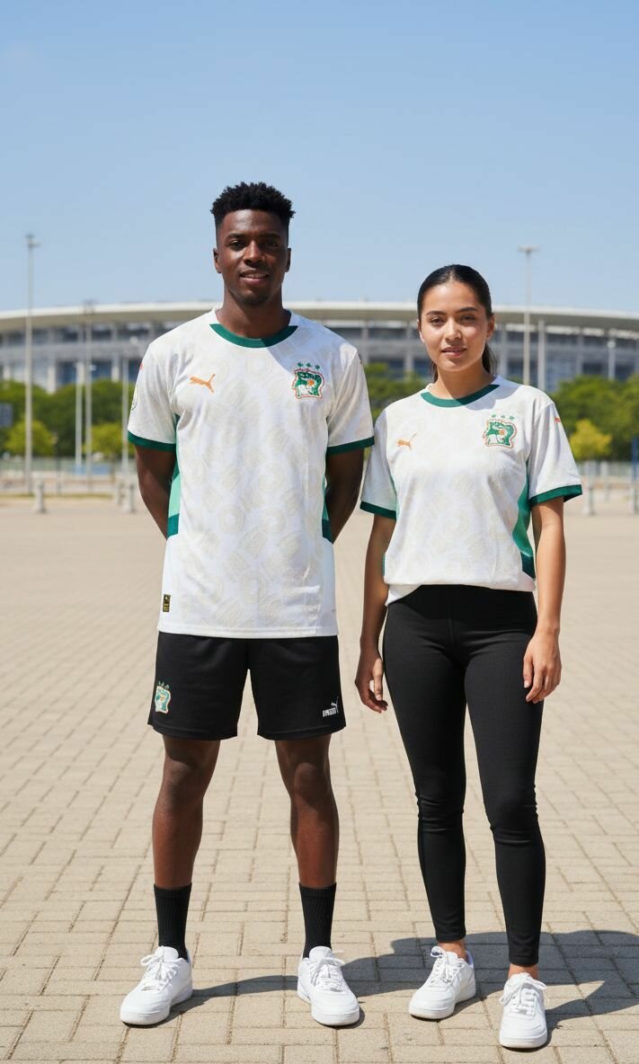 Maillot officiel de l'équipe nationale de football de Côte d'Ivoire. Design moderne avec des détails verts. Idéal pour les supporters et les passionnés de football. Disponible en diverses tailles pour hommes et femmes. Tissu respirant pour un confort optimal pendant les matchs ou le sport en général.