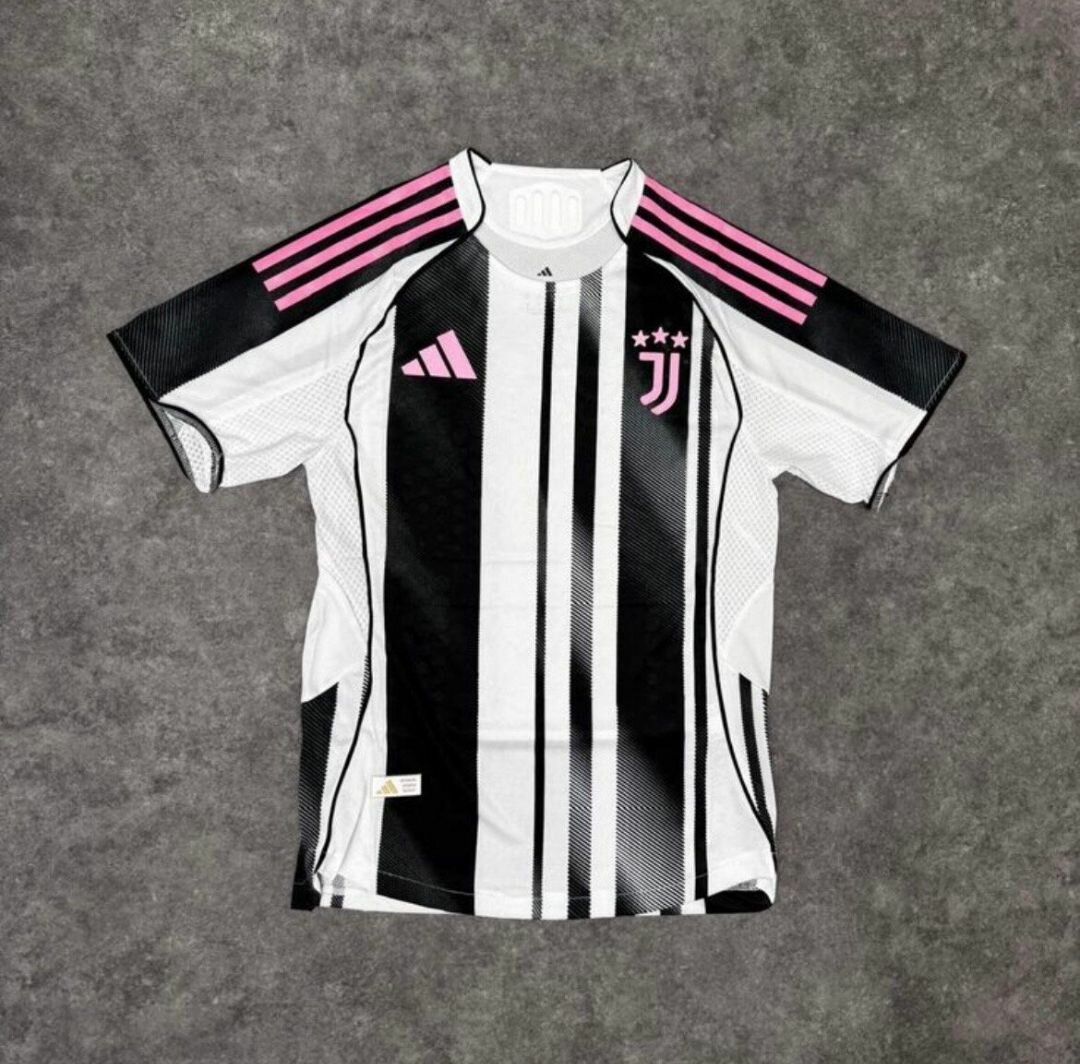 Nouveau maillot de football domicile de la Juventus, design moderne noir et blanc avec détails roses. Idéal pour les fans et les sportifs. Confort supérieur, parfait pour l'entraînement et les matchs.