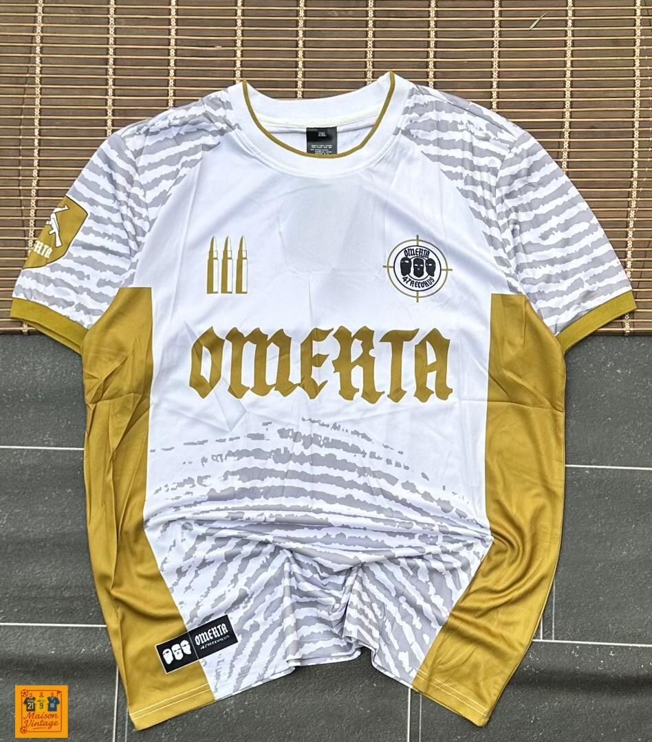 Maillot de football Omerta blanc et or pour les fans de football. Conçu pour les supporters et les joueurs, ce maillot est idéal pour les matchs et les entraînements. Fabriqué avec des matériaux de qualité, il offre confort et durabilité.