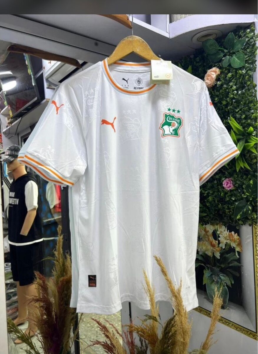 Découvrez le maillot officiel de l'équipe de football de la Côte d'Ivoire, arborant les couleurs emblématiques et le design moderne. Parfait pour les supporters et les amateurs de football. Disponible en blanc et orange, ce maillot offre confort et style.