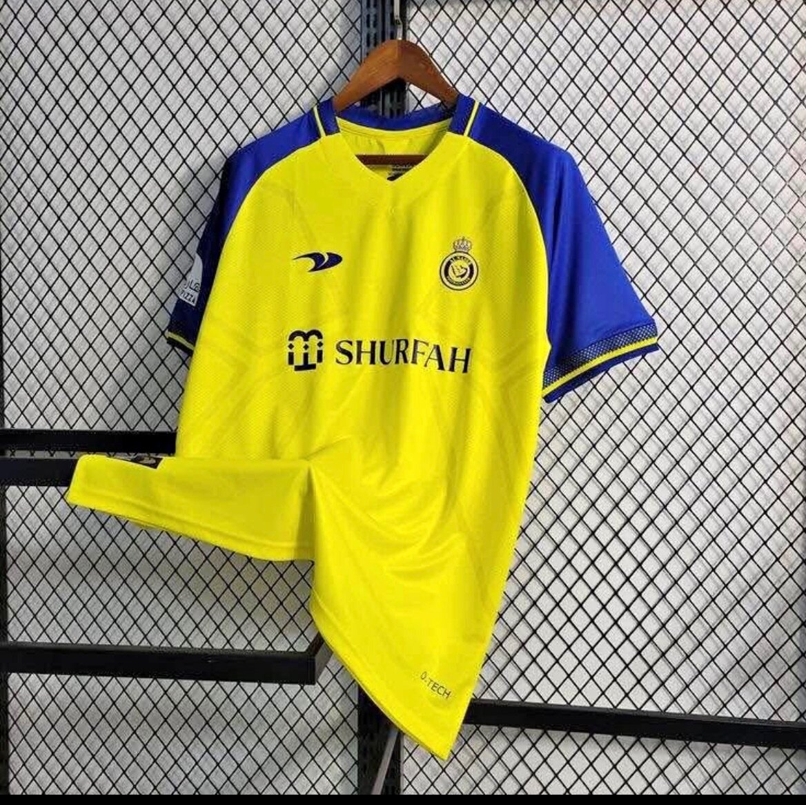Maillot de football Al-Nassr FC jaune et bleu pour les vrais supporters. Confortable et respirant, il est idéal pour le sport ou le style décontracté. Montrez votre soutien avec style !