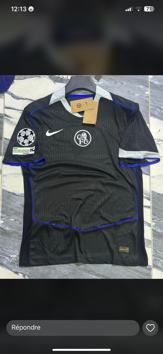 Découvrez ce maillot de football élégant et moderne, parfait pour les fans passionnés. Fabriqué avec des matériaux de haute qualité, il garantit un confort optimal pendant vos matchs. Son design noir épuré avec manches aux détails blancs et bleus en fait un choix idéal pour soutenir votre équipe préférée, sur le terrain ou lors des sorties en ville.