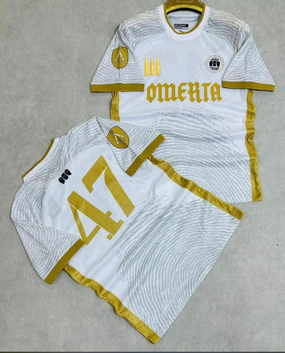 Découvrez le maillot de football Omerta, parfait pour les amateurs de style et de sport. Conçu en tissu respirant, il offre un confort optimal lors des entraînements ou des matchs. Disponible en blanc et noir avec des touches dorées et rouges, il allie élégance et performance. Idéal pour les fans et les sportifs, ce maillot est un ajout stylé à votre garde-robe sportive.