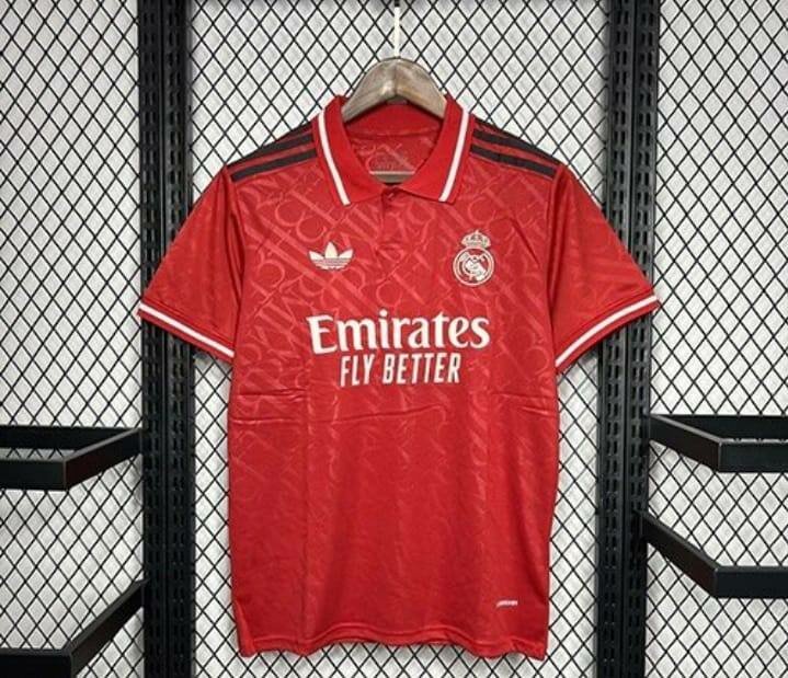 Maillot de football du Real Madrid rouge avec logo, idéal pour supporters. Confortable et stylé, parfait pour les matchs et le quotidien.