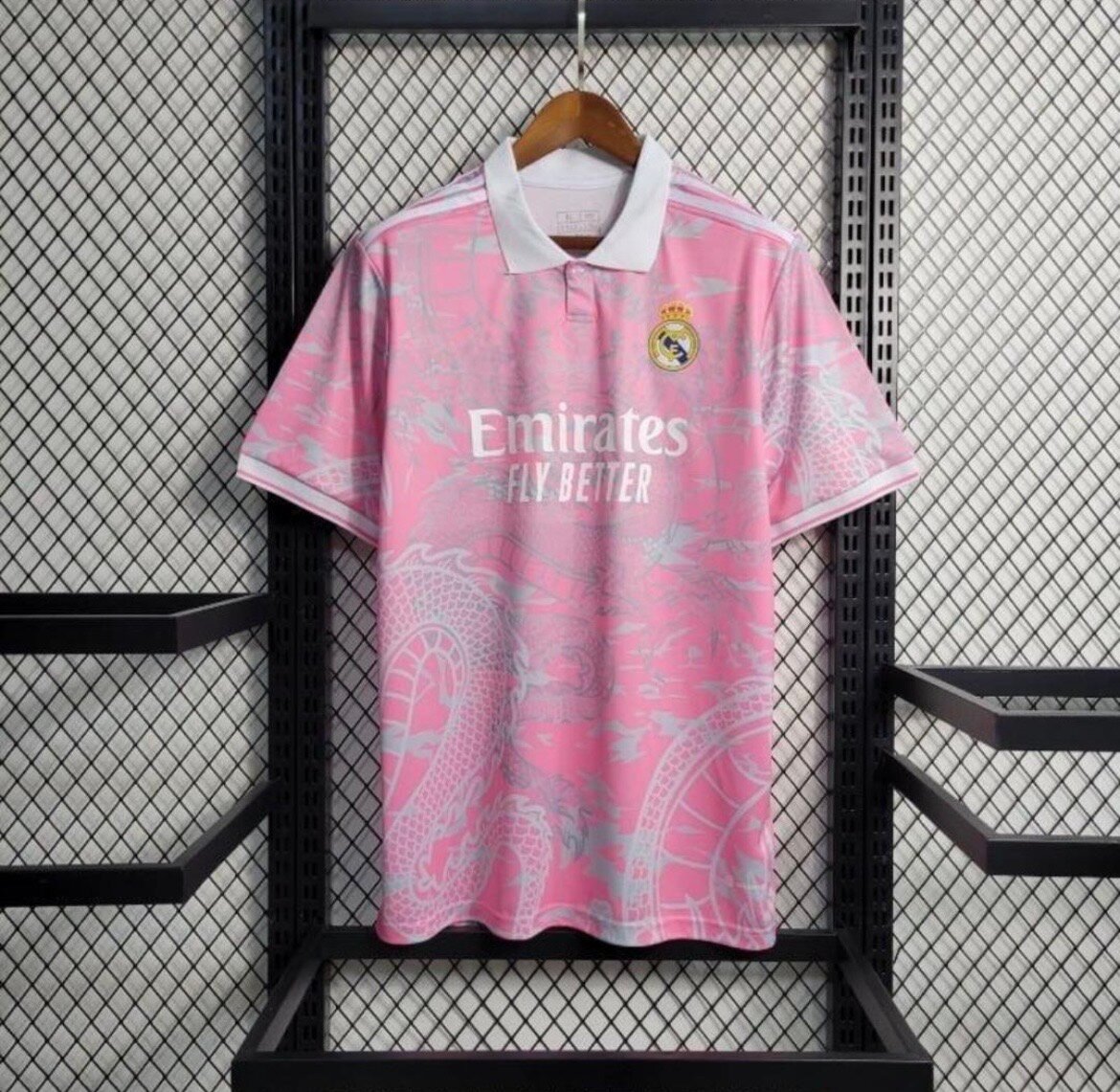 Maillot de football rose élégant avec col blanc et emblème brodé, parfait pour les fans de sport. Son design unique et respirant en fait un choix parfait pour les matchs ou les loisirs. Un must pour tout passionné de football!