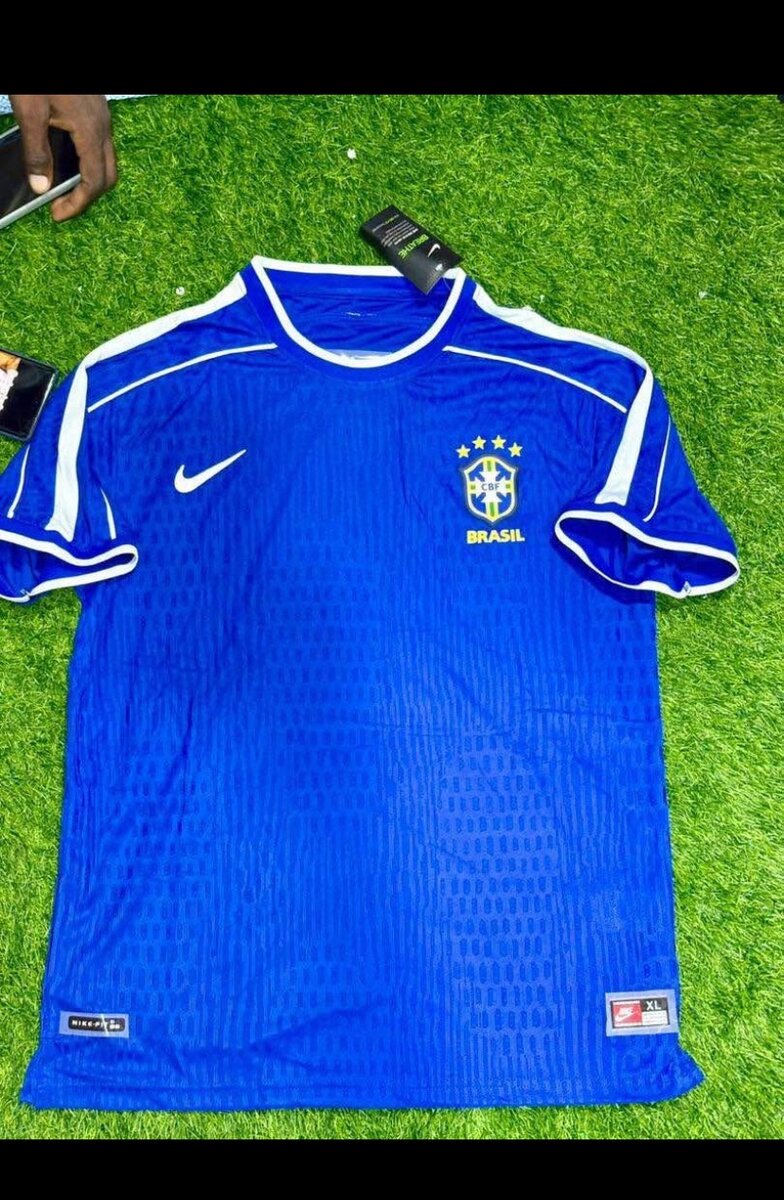 Maillot de football officiel du Brésil en bleu, signé Nike. Parfait pour les fans et les joueurs, il assure confort et style sur le terrain.