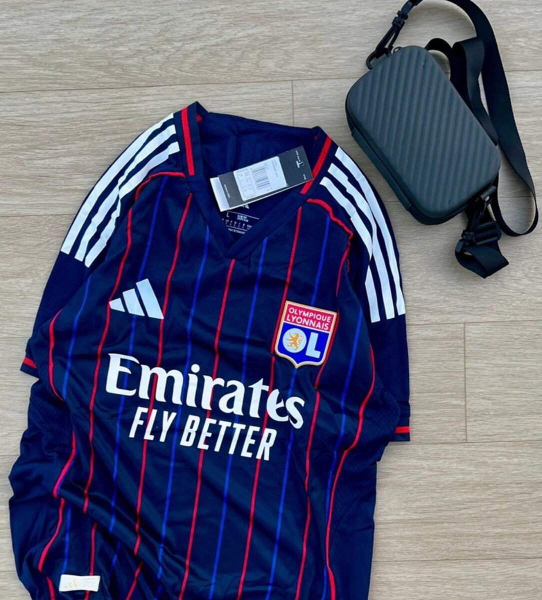 Maillot officiel Olympique Lyonnais, parfait pour les fans du club. Design moderne, couleur bleu avec rayures rouges, idéal pour matches et loisirs. Achetez ce maillot pour afficher votre soutien avec style et confort.