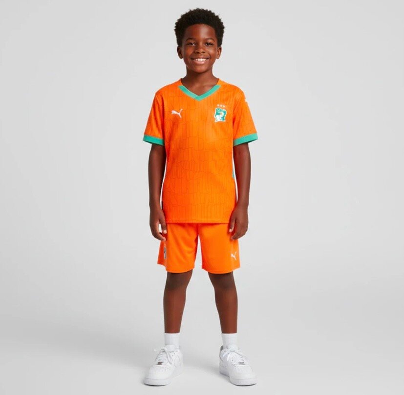 Ensemble de football pour enfants aux couleurs vives de la Côte d'Ivoire. Design confortable avec logo distinctif, idéal pour les jeunes fans. Fait de matériaux respirants parfaits pour le sport et les loisirs.