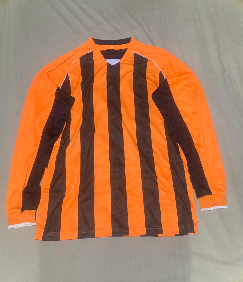 Maillot à manches longues avec rayures verticales noires et orange vif, offrant confort et style.