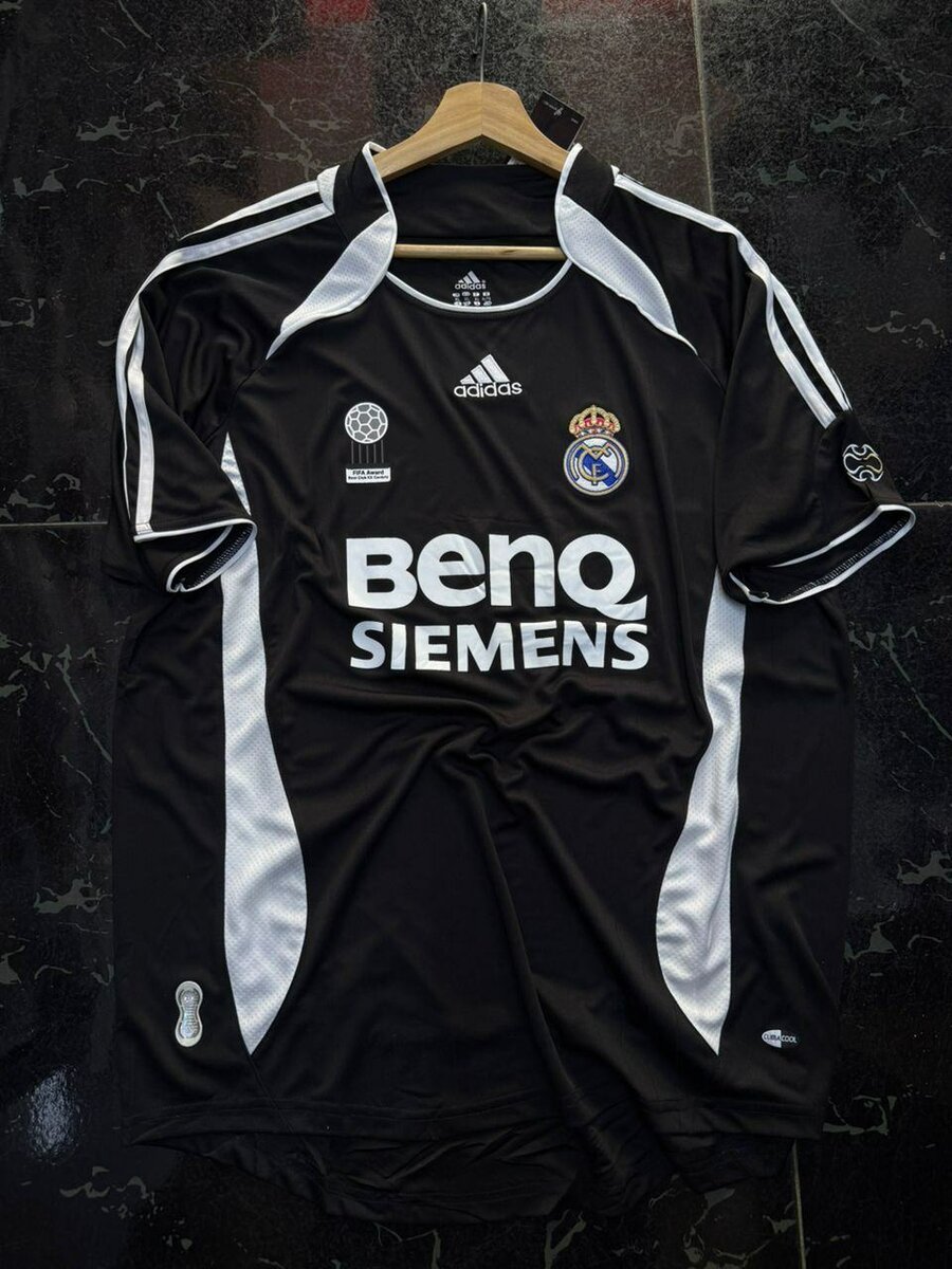 Découvrez le maillot iconique du Real Madrid signé Adidas, avec sponsor BenQ Siemens. Conçu pour le confort et la performance, idéal pour les fans et les collectionneurs de football. Disponible en blanc et noir, parfait pour afficher votre passion.