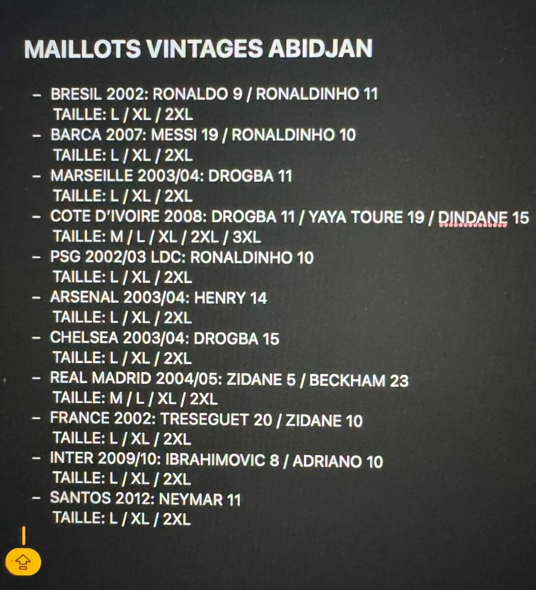 Découvrez notre collection de maillots de football vintage 'Maillots Vintages Abidjan' avec des légendes telles que Ronaldo, Zidane, Messi et plus. Disponibles en tailles variées, ces maillots sont parfaits pour les amateurs du ballon rond ou comme pièce de collection exclusive. Profitez de la qualité et du style authentique des maillots des champions mondiaux. Parfait pour les supporters et les passionnés de foot.