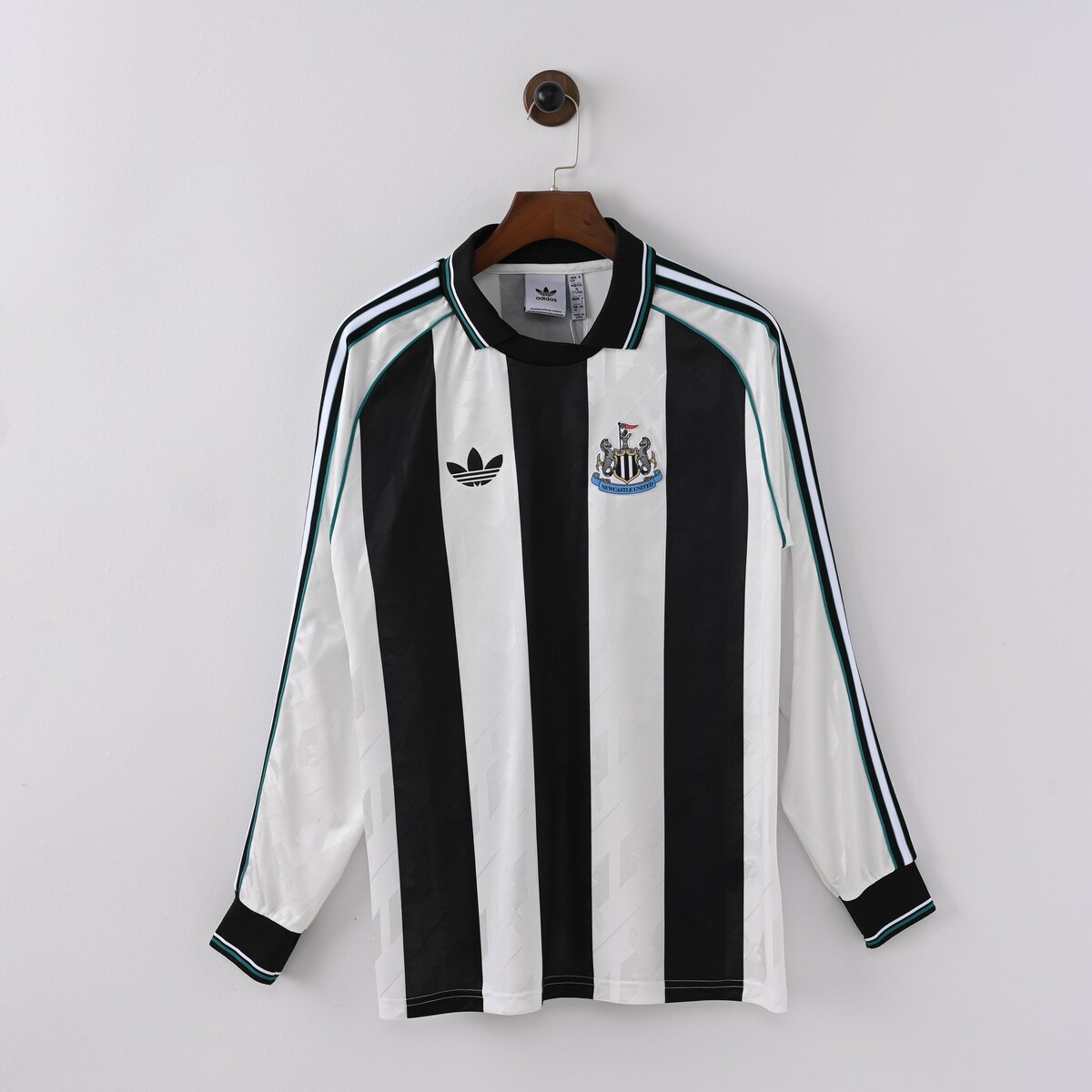 Maillot de football vintage à manches longues. Design rayé noir et blanc avec logo distinctif brodé. Idéal pour les amateurs de sports et le style rétro. Parfait pour porter lors des matchs ou comme pièce mode.