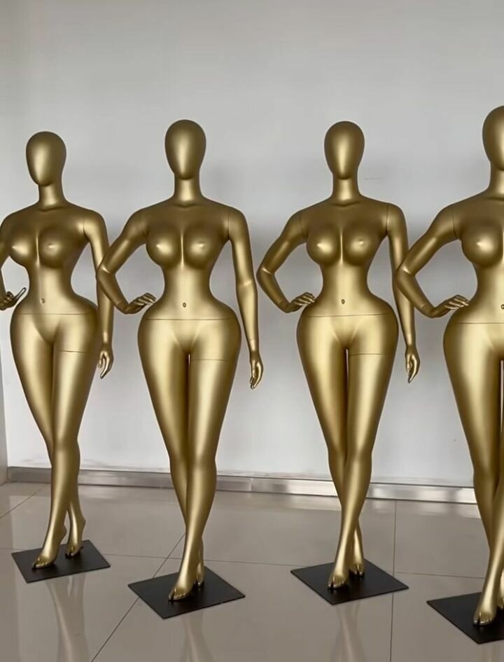 Mannequin féminin en plastique doré ou noir pour la présentation de vêtements en magasin. Robuste et élégant, idéal pour les boutiques de mode et les professionnels de la vente au détail.