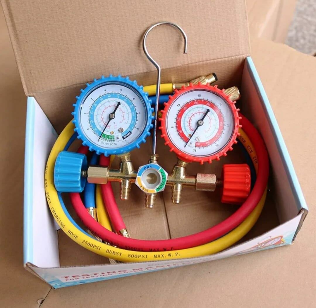 Ensemble de manomètres pour réfrigération HVAC, idéal pour le diagnostic et l'entretien des systèmes de climatisation. Avec tuyaux colorés robustes et crochets pratiques, ce kit est parfait pour les professionnels et les amateurs avertis. Haute précision et durabilité.