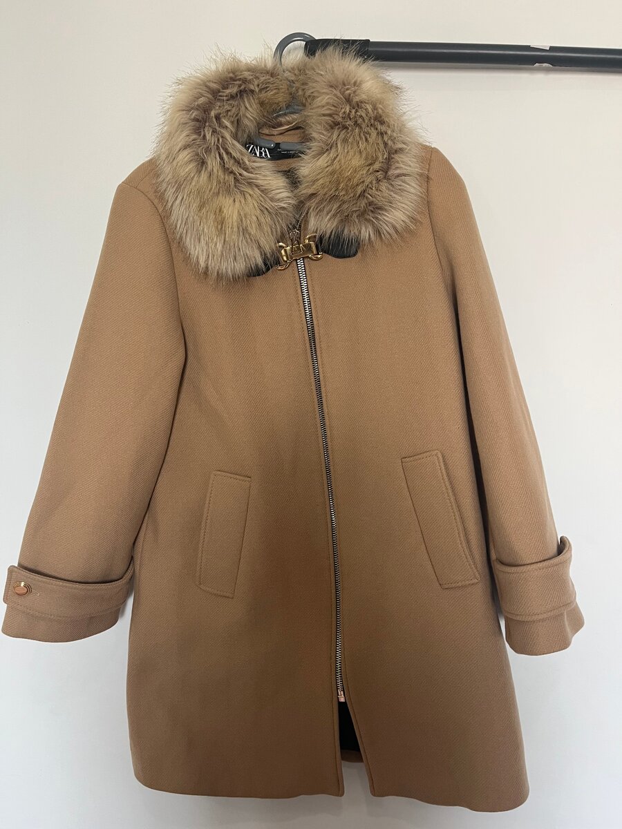Magnifique manteau long en laine beige de la marque ZARA, avec une capuche en fourrure et une fermeture éclair. Conçu pour les femmes, il offre un style élégant et chaud pour l'hiver. Taille ajustable avec des poches latérales.