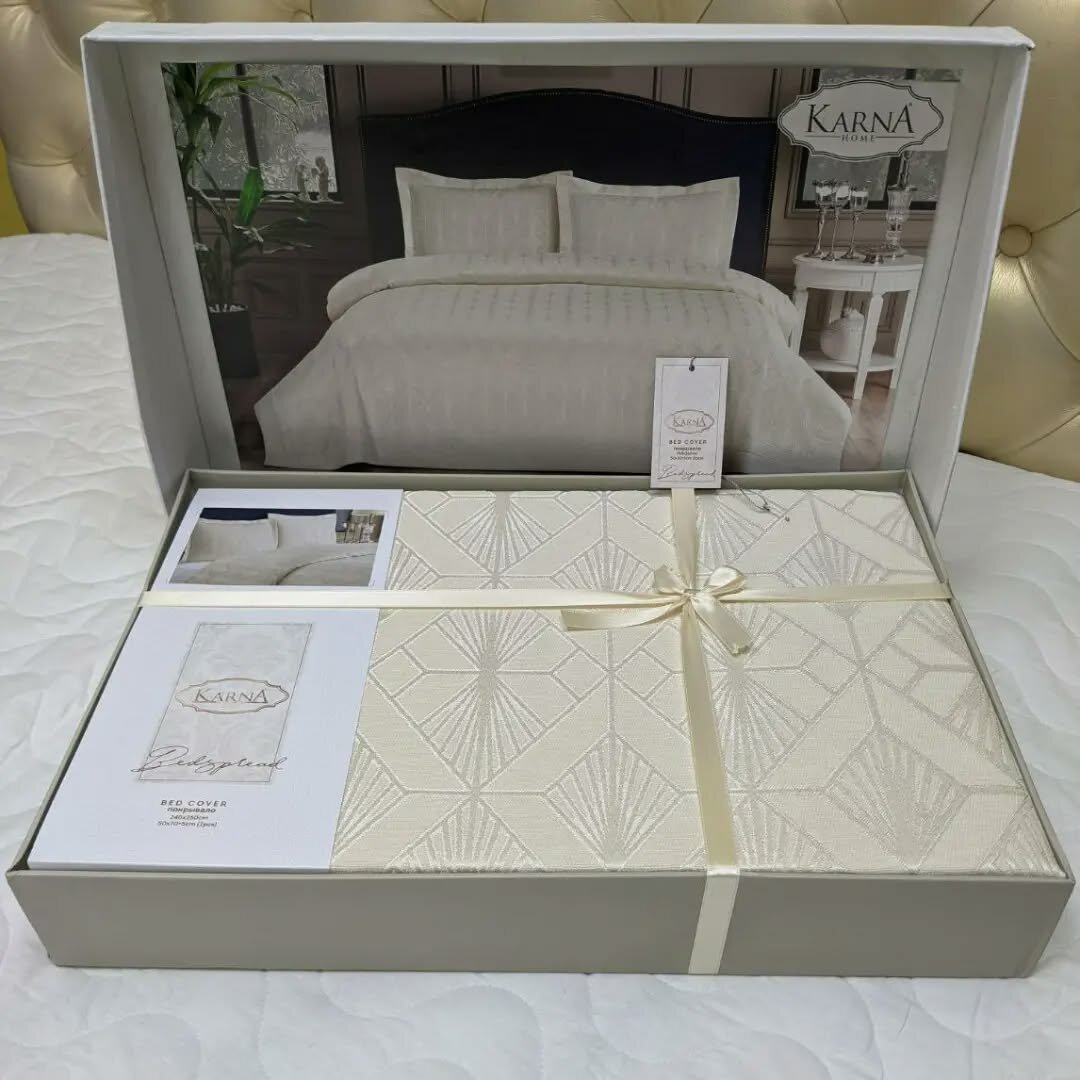 • Держит краску и сохраняет первоначальный внешний вид даже после многократных стирок.🌸 Комплект состоит из покрывала (240x260), 2 наволочек (50х70+5), украшен оригинальным жаккардовым рисунком и упакованн в подарочную коробку.