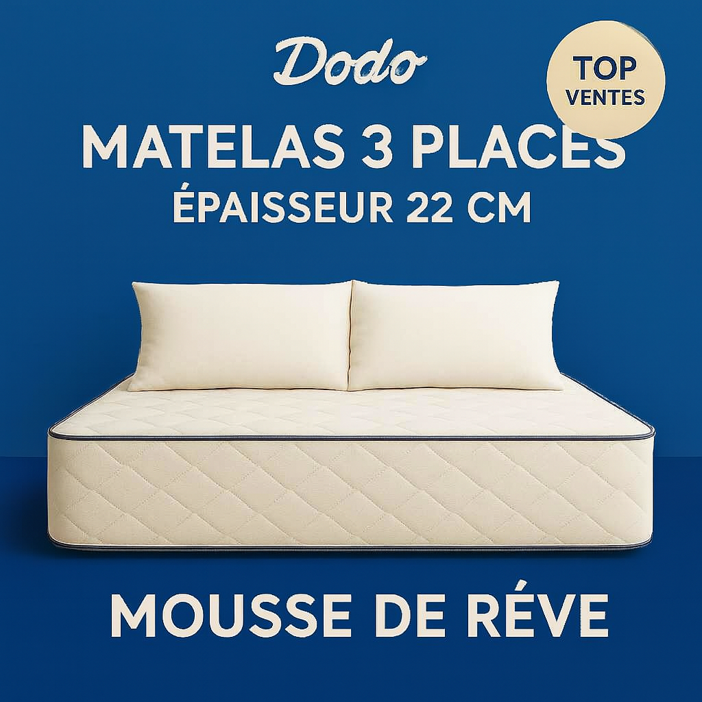 Le matelas 3 places 22 cm est conçu pour ceux qui recherchent espace, fermeté et confort. Avec sa grande surface et son épaisseur généreuse, il offre un soutien optimal du dos, réduit les points de pression et garantit un sommeil paisible et réparateur, même à deux ou trois dormeurs.