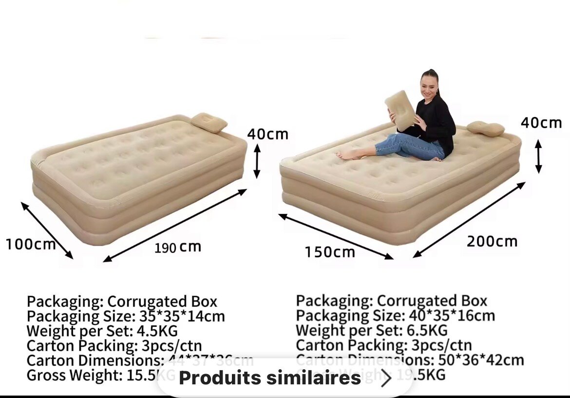 Découvrez le matelas gonflable double, parfait pour le camping ou les invités à la maison. Avec sa surface douce et son support robuste, il offre un sommeil réparateur. Facile à gonfler et transporter, c'est une solution pratique pour toutes vos nuits en extérieur ou à domicile.