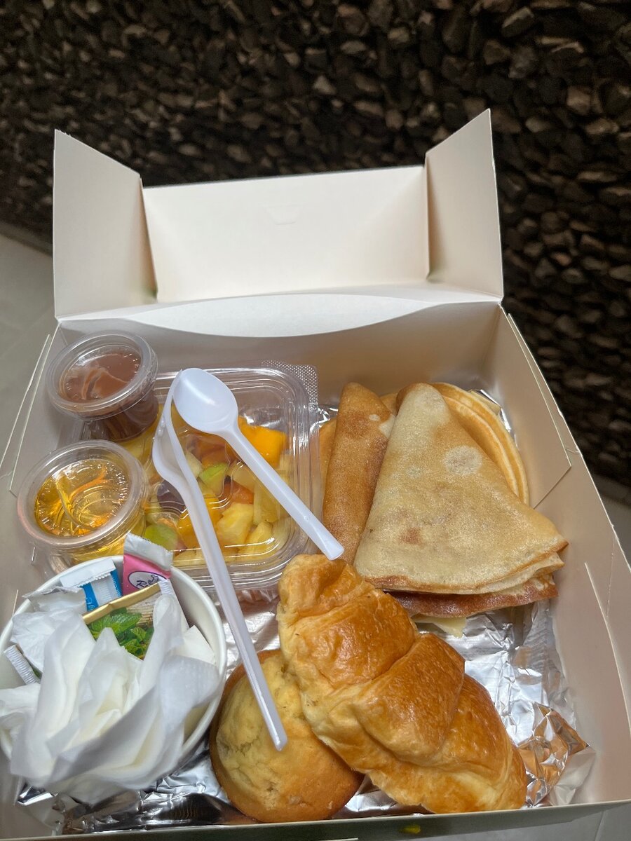 Un réveil plein de douceur avec notre mini box petit dej : crêpes, pancakes,, croissant, cake accompagnés dune salade de fruits et d'un thé. Le combo parfait pour bien commencer la journée