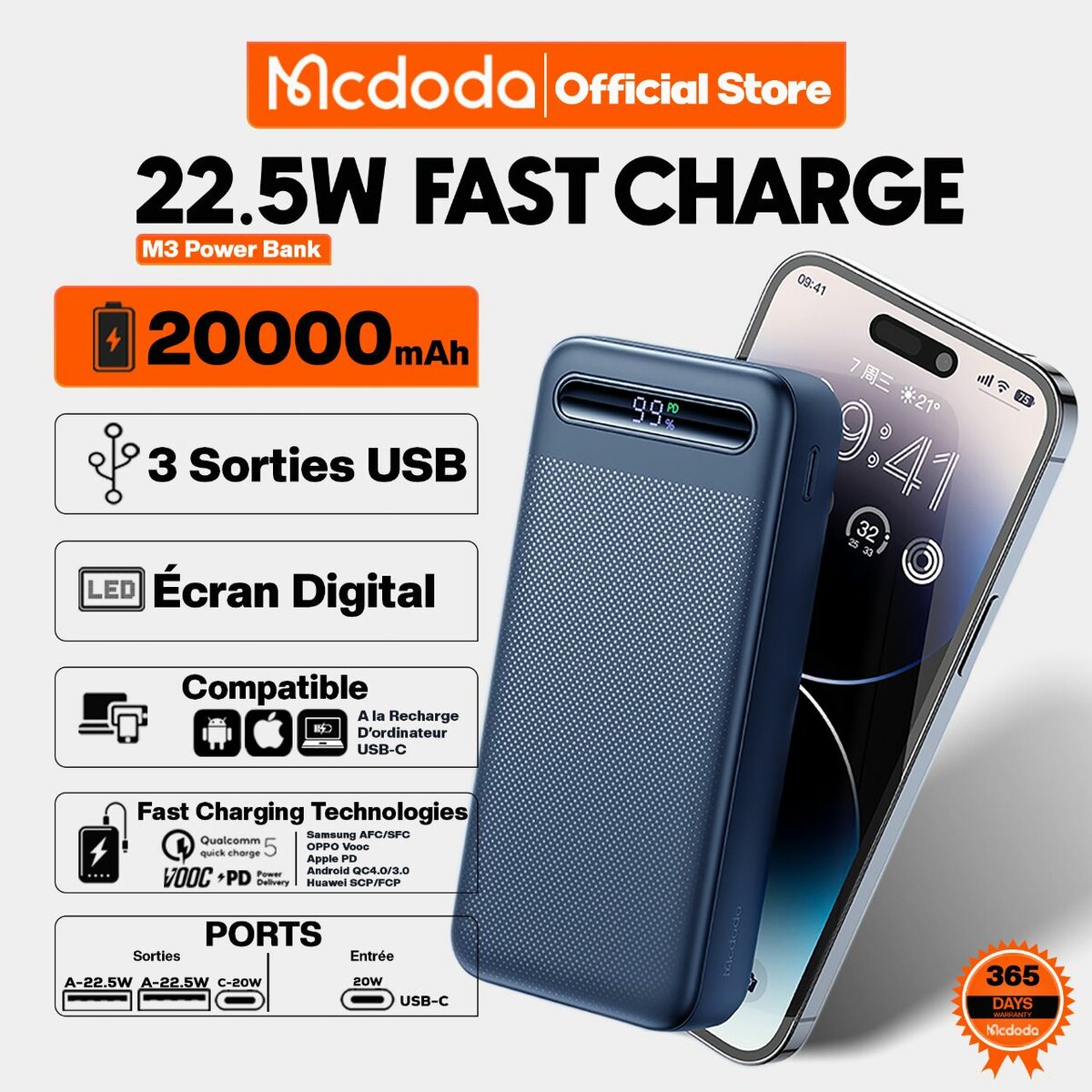 Optez pour la batterie externe Mcdodo de 20000mAh avec charge rapide 22.5W. Idéale pour une utilisation intensive et compatible avec divers appareils, elle offre un écran digital et plusieurs ports USB pour une charge efficace. Parfaite pour les voyages et déplacements quotidiens.