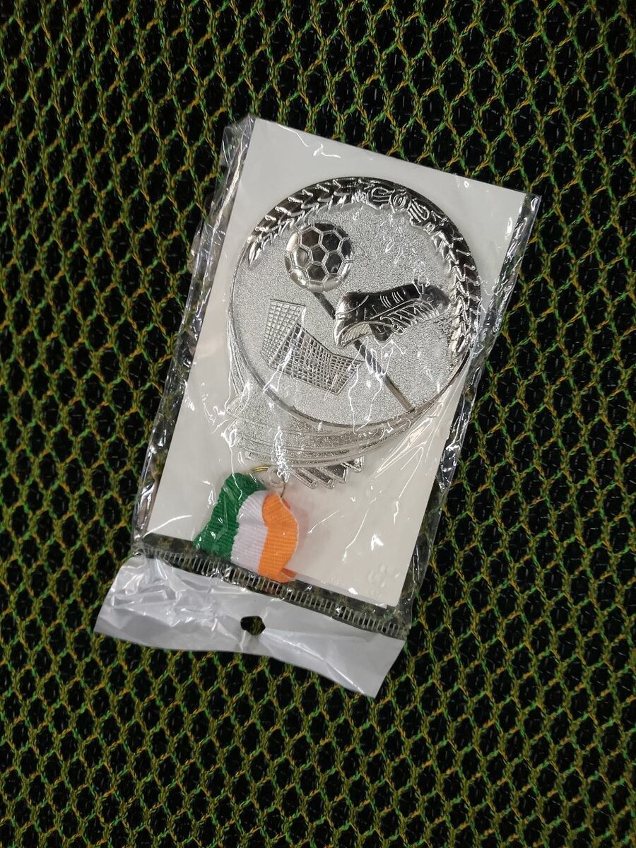 Célébrez votre victoire avec cette élégante médaille de football en argent, ornée d'un ruban aux couleurs vives. Parfaite pour les compétitions, elle honore les performances exceptionnelles.