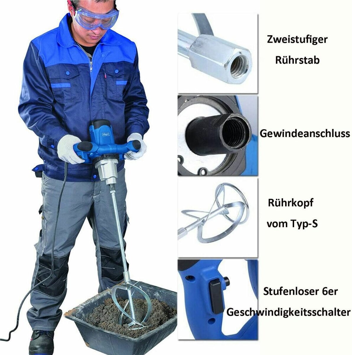 Puissant mélangeur électrique à 6 vitesses avec tête de brassage type S. Parfait pour le mélange de ciment, peinture et autres matériaux. Design ergonomique pour un confort optimal.