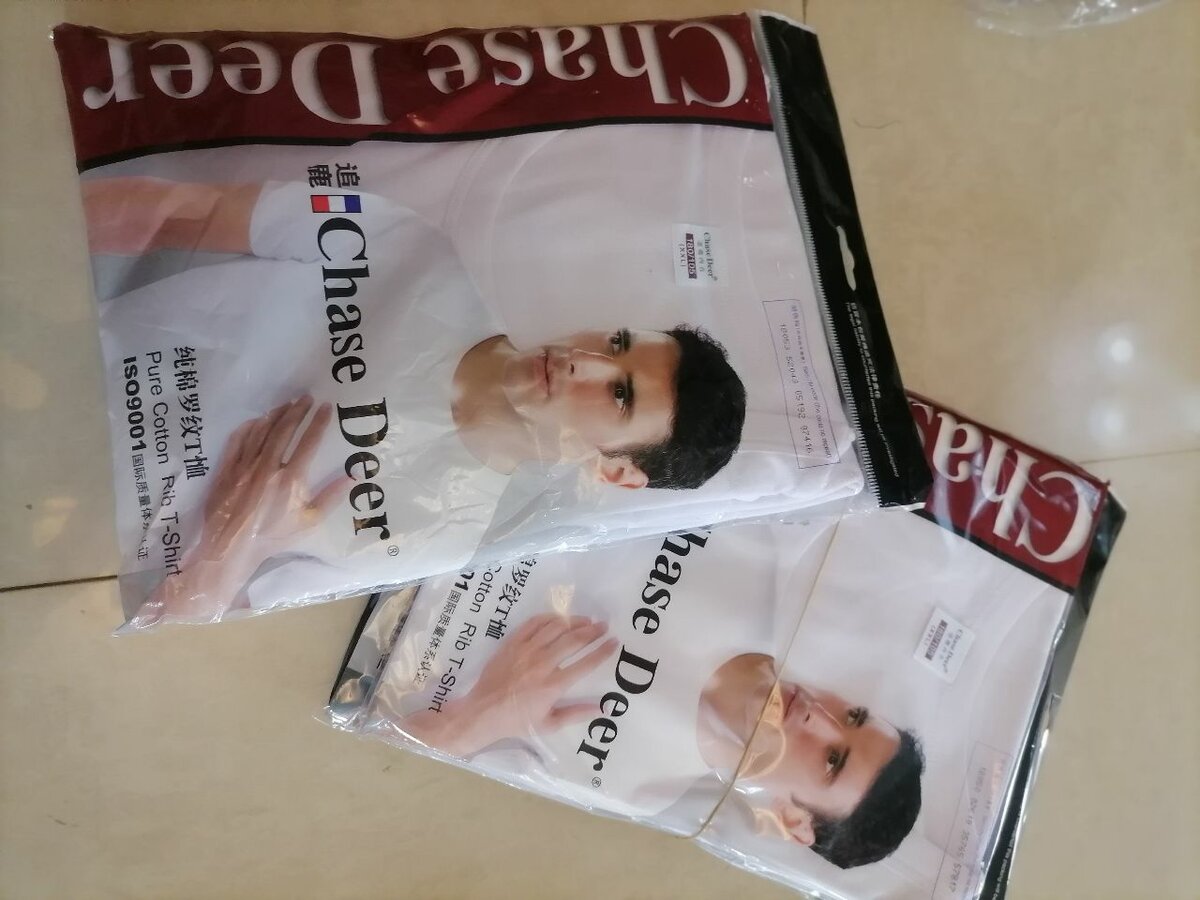 Chase Deer pure cotton rib t-shirt. White and black colours available. XXL, XL, L and M (extra extra large, extra large, large and medium sizes). Soft comfortable feel, good stretch, ideal design for the body. Good moisture absorption and air permeability. Does not deform after washing. 100% pure cotton.