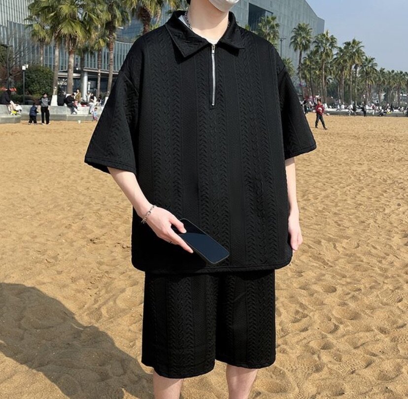 Men's Polos Shirts Set Short Sleeve Shorts Men's Zipper T-Shirts-Black Size - Medium to XXXXXL Available