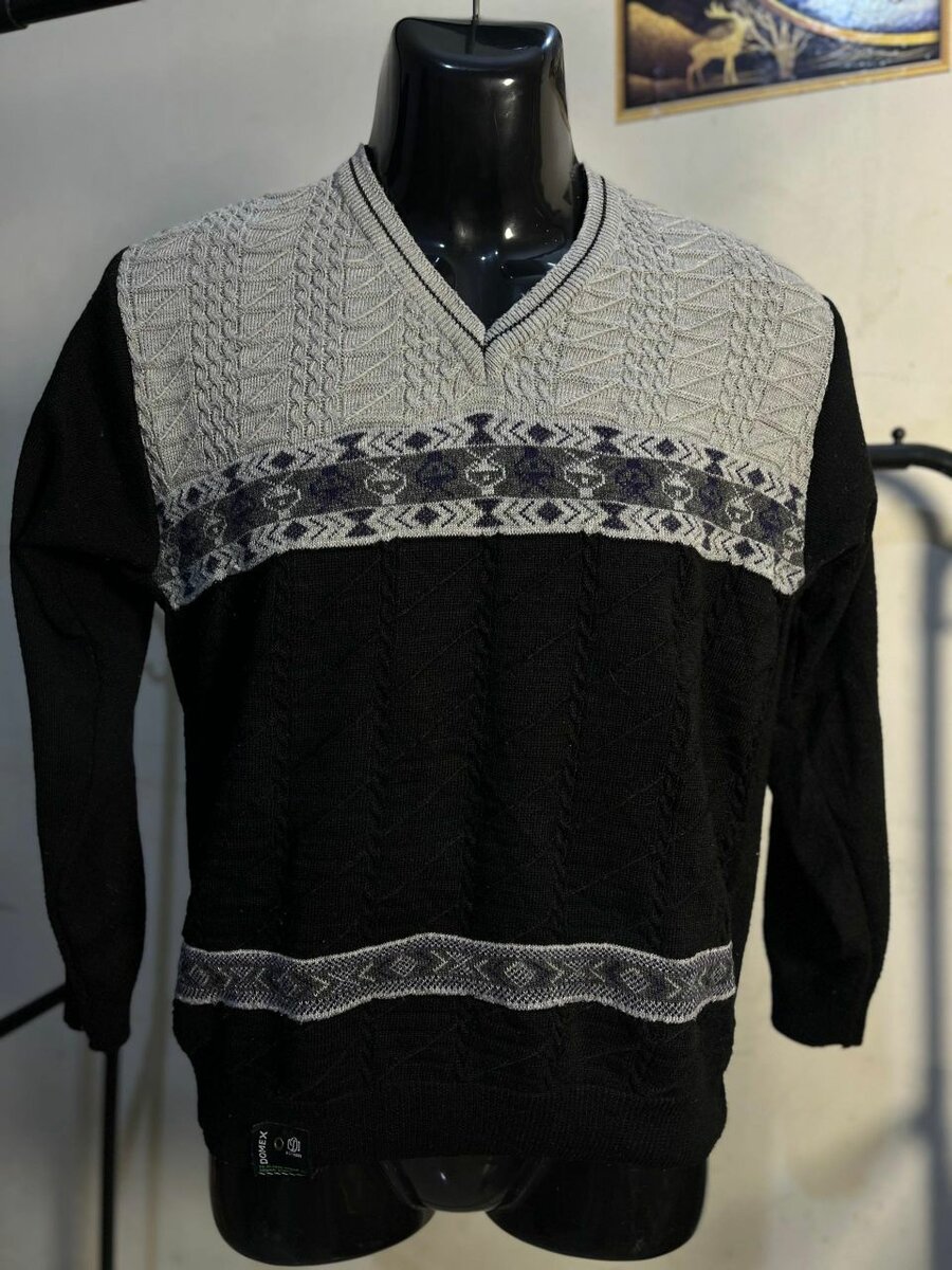 Stay warm and stylish with this men's wool V-neck sweater featuring a chic geometric pattern. Perfect for casual outings or layering in colder weather. Made from soft wool for comfort and durability, this sweater is an ideal addition to your wardrobe. Great for pairing with jeans or dress pants for a versatile look.