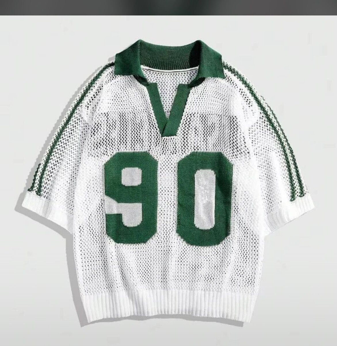 Unleash your sporty style with this mesh knit jersey! Featuring a bold '90' print and green accents, it's perfect for casual outings or game days. Comfortable and breathable, ideal for layering or on its own. Make it your go-to stylish piece.